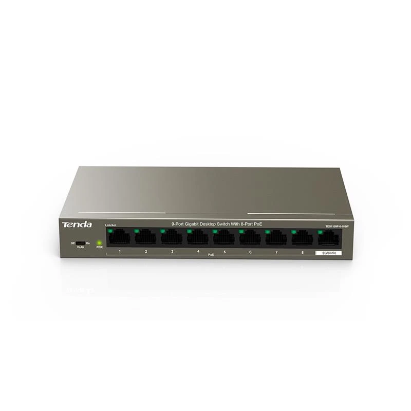 TEG1109P-8-102W — це гігабітний некерований комутатор блискавкозахисту, розроблений Tenda спеціально для потреб побудови гігабітної WLAN і мережі монітора камери HD. З високопродуктивним доступом, 9-10/100/1000M портами Ethernet RJ45 Base-T; 6KV блискавкозахист для всіх портів; кожен окремий порт підтримує MDI/MDIX і дротову швидкість; Порти PoE підтримують стандарт IEEE802.3at/af, автоматично виявляючи та розпізнаючи пристрій живлення стандарту IEEE802.3at/af. Через звичайний кабель витої пари Cat 5e можна передавати живлення разом із даними для точки доступу, IP-камери та IP-телефону. Завдяки динамічному живленню PoE, простішій конфігурації, гнучкому розширенню мережі без обмеження розкладкою лінії електропередач, підключай і працюй, допомагаючи малому та середньому бізнесу, готелям, торговим центрам, школам побудувати мережу високого рівня безпеки та надійності бездротового покриття та монітора HD.
