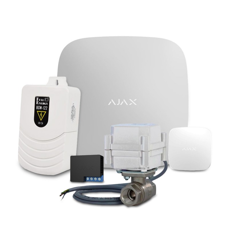Комплект антизатопления включает в себя: централь Ajax Hub, датчик затопления Ajax LeaksProtect (white), беспроводное реле Ajax Relay, шаровой кран BUGATTI ШЭП ¾” ULTIMATE 12 В, блок питания BGW-122