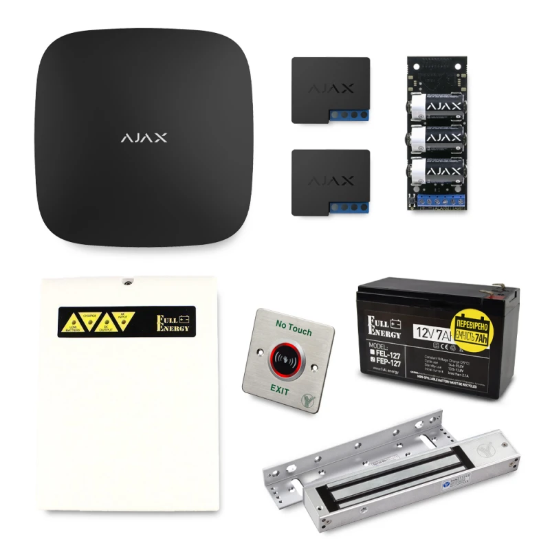 Централь Ajax Hub black – 1 шт, Беспроводное реле Ajax Relay – 2 шт, Беспроводной модуль Ajax Transmitter – 1 шт, Блок бесперебойного питания Full Energy BBGP-123 – 1 шт, Аккумулятор 12В 7 А⋅ч для ИБП Full Energy FEP-127 – 1 шт, Кнопка выхода Yli Electronic ISK-841C – 1 шт, Уголок монтажный MBK-280NL на узкую дверь – 1 шт, Электромагнитный замок YM-280N – 1 шт