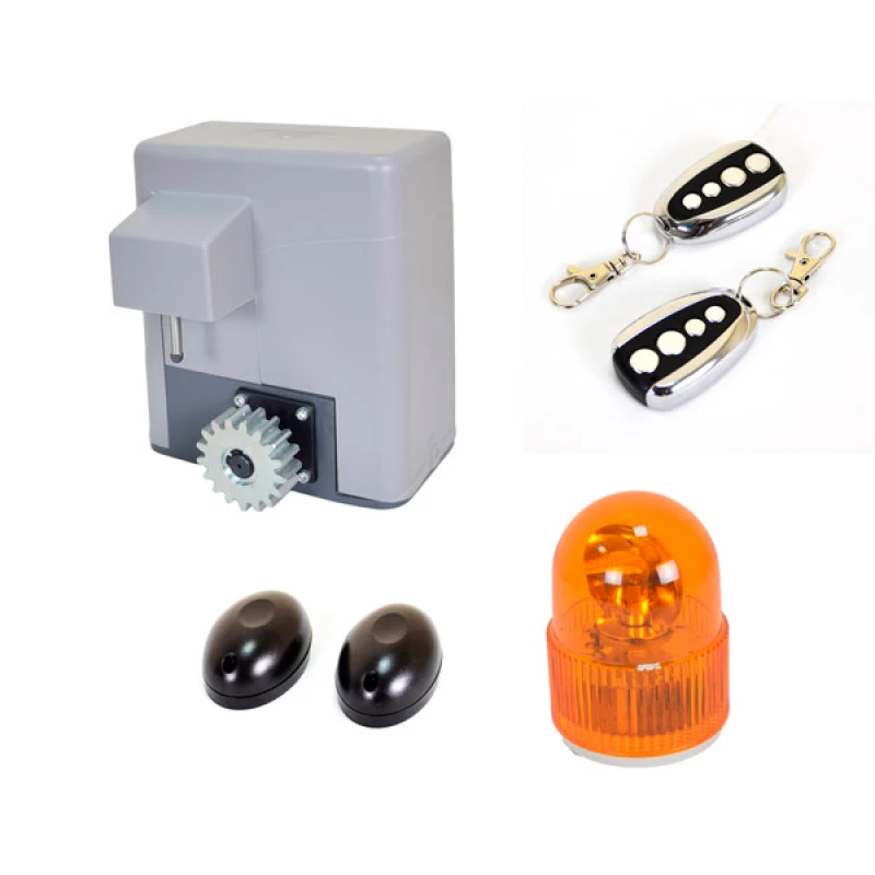 В расширенный комплект входит привод для ворот весом до 600кг с автоматикой, 2 пульта управления приводом, ИК барьер, сигнальная лампа, 4 зубчатые рейки по 1м каждая и 2 ограничителя на рейку концевика.