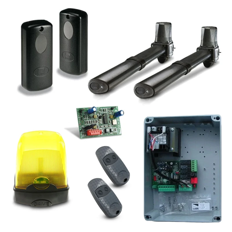 2 привода, блок управления в коробе, радиоприемник, 2 пульта ДУ, сигнальная лампа, фотоэлементы безопасности