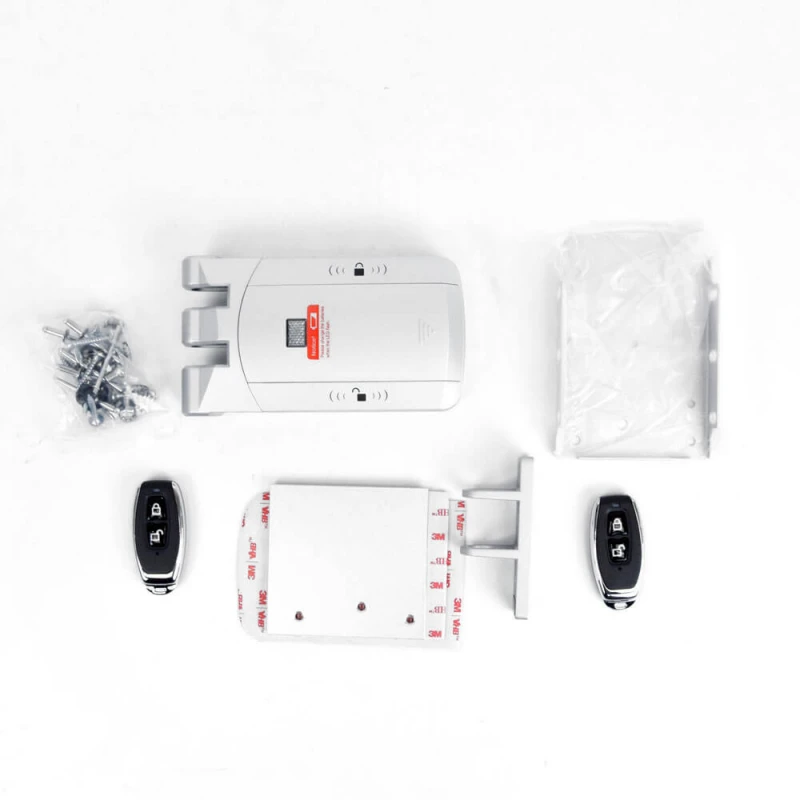 электроригельный замок, 2 пульта управления, 3M скотч, крепежный комплект, инструкция