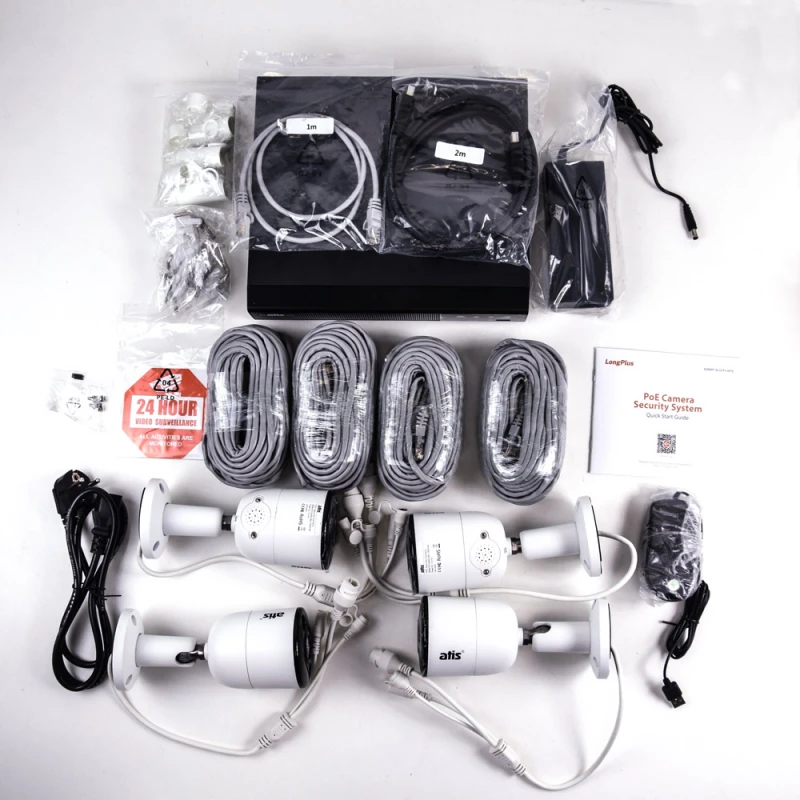 Комплект IP відеоспостереження для самостійної установки ATIS IP 4 kit 5Mp включає: IP відеореєстратор з USB-мишею, 4 вуличні циліндричні IP відеокамери роздільної здатності 5 Мп, 1 HDMI кабель довжиною 2 м, 1 LAN кабель довжиною 1 м, 4 LAN кабелі RJ-45+живлення по 18 м, 1 блок живлення.