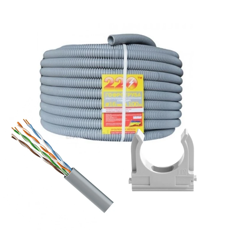 Комплект: Кабель витая пара ЗЗЦМ UTP кат.5e, 4х2х0.51 бухта 305 м (медь, внутренний) (7091001) + Гофротруба 220 TM Standart D 32 мм (25 м) cерая + Клипса для гофры 32 мм (50 шт/уп) серая