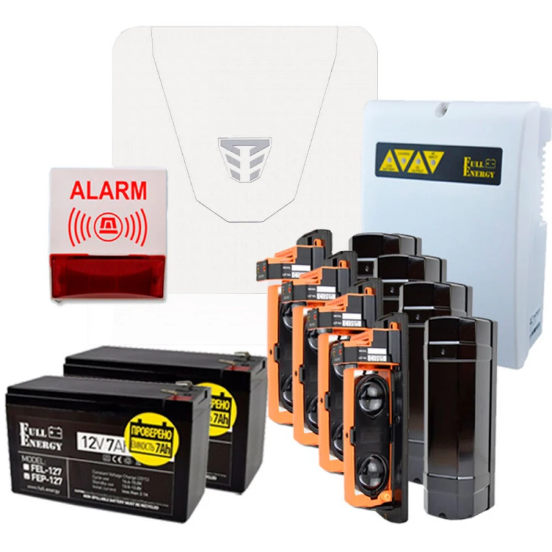 Комплект охоронної сигналізації №003 включає: ППКОП, 4 шт ІЧ-бар'єрів, безперебійний блок живлення, 2 акумулятора, світлозвуковий сповіщувач, 400м звитої пари, а також 10м силового кабелю.