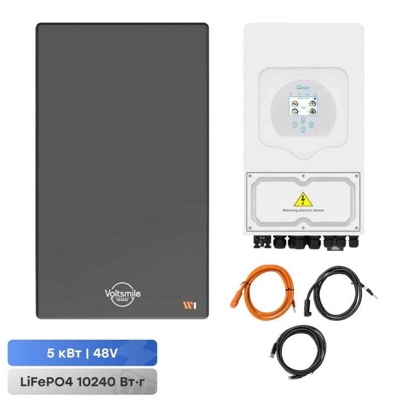 Комплект резервного живлення: гібридний інвертор Deye SUN-5K-SG03LP1-EU 5kW і акумуляторна батарея 51.2В Voltsmile W1 Classic. Інвертор: гібридний однофазний інвертор з номінальною потужністю 5 кВт з 2 вбудованими MPPT-контролерами та вбудованим зарядним пристроєм; максимальна короткочасна потужність 5.5 кВт; напруга акумуляторної батареї 40-60 В; максимальний струм заряду/розряду 120 А/120 А; вхідна напруга 230 В; ККД >97%; діапазон напруги від сонячних панелей 100-500 В, максимальна потужність сонячних панелей 6500 Вт; вихідна напруга 230 В; вихідна частота 50/60 Гц; підтримка заряду АКБ типу AGM/GEL/LiFePO4/Li-ion; комунікаційні інтерфейси WiFi, CAN, RS485; настінний монтаж; клас захисту IP65; температура середовища -25°C~+60°C; розміри 680 / 420 / 233 мм, вага 32 кг. Акумуляторна батарея: настінна літій-залізо-фосфатна акумуляторна батарея для системи накопичення енергії; напруга 51.2 В; ємність 200 Аг / 10240 Втг; максимальний струм заряду/розряду 100 А/100 А; ресурс: 6000 циклів заряджання-розряджання; комунікаційні порти CAN, RS485; клас захисту IP67; в одну систему можна підключити до 16 акумуляторних модулів; розміри 888 / 518 / 150 мм; вага 90 кг. Комплект кабелів для підключення акумуляторних батарей Voltsmile серій W, V, RPC до інвертора містить: кабель живлення від акумулятора до інвертора «+» 4AWG, довжина 2 м – 1 шт.; кабель живлення від акумулятора до інвертора «-» 4AWG, довжина 2 м – 1 шт.; кабель зв’язку між акумулятором та інвертором 4AWG, довжина 2 м – 1 шт.