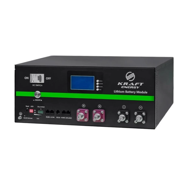 Комплект резервного живлення: гібридний інвертор на 6kW Kraft + АКБ 48В 10240Втг Kraft KRF-48/200BRM LiFePO4. Гібридний низькочастотний однофазний інвертор з максимальною потужністю 6 кВт; правильна синусоїда на виході 220 В; вбудований MPPT-контролер та мережевий зарядний пристрій; струм заряду 5-45 А для акумуляторних батарей / 10-60 А для сонячних панелей; напруга акумуляторної батареї 48 В; вхідна напруга 180-265 В (режим ДБЖ), 160-265 В (режим інвертора), від сонячних панелей 65-150 В; вхідна частота 45-65 Гц; вихідна напруга в AC-режимі 180-265 В (режим ДБЖ), 160-265 В (режим інвертора), в режимі АКБ 230 В; вихідна частота 50/60 Гц; час перемикання на АКБ 10 мс; підтримка заряду АКБ 8 типів, в тому числі AGM/GEL/LiFePO4; захист від перевантаження, короткого замикання; робоча температура 0°C~+40°C; розміри 480 / 286 / 251 мм; вага 29 кг. Акумуляторна батарея літій-залізо-фосфатна (LiFePO4); номінальна напруга 48 В; номінальна ємність 10240 Втг; максимальний струм заряду/розряду 100 А/100 А; ресурс: >6000 циклів заряджання-розряджання; комунікаційні порти CAN, RS485; в одну систему можна під'єднати до 8 акумуляторних батарей; монтаж у стійку 19" висотою 4U; захист від перерозряду, перезаряду, надмірного струму, короткого замикання, перегріву; розміри 810 / 483 / 178 мм; вага 79.3 кг