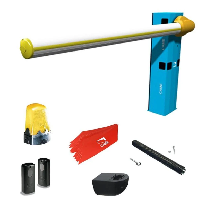 стойка шлагбаума со встроенной панелью управления, круглая стрела диаметром 60 мм и длиной 4.2 м, пружина балансировки диаметром 50 мм, 10 наклеек на стрелу, комплект фотоэлементов (передатчик и приемник), сигнальная лампа 24 В и крепление для сигнальной лампы