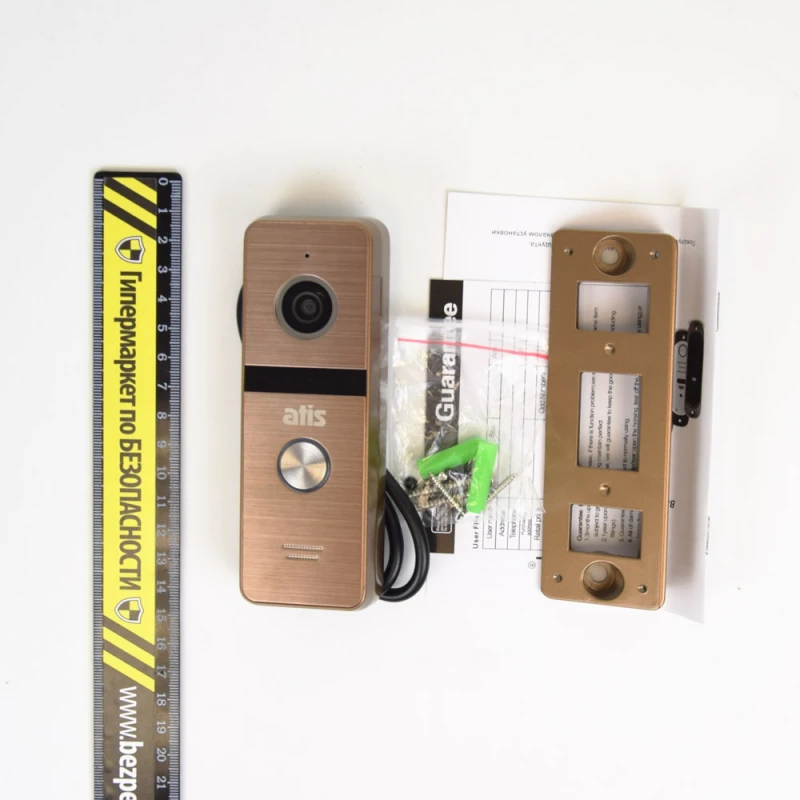 В комплекте видеодомофон + вызывная панель ATIS AD-1070FHD/T White + AT-400HD Gold предусмотрено всё для беспроблемной установки: монтажные аксессуары, соединительные провода и установочные кронштейны.