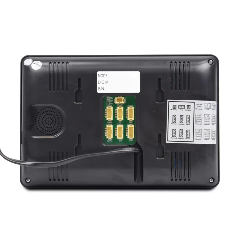 Состоит из цветного видеодомофона черного цвета с экраном 7 дюймов и сенсорными кнопками управления и цветной вызывной панели черного цвета с разрешением 1000ТВЛ и накладным способом установки. К домофону возможно подключить 2 панели вызова и 2 аналоговые камеры, поддерживается запись фото/видео, есть детектор движения на 4 канала (одновременно запись с 1, где есть движение), слот для карт памяти до 32ГБ.