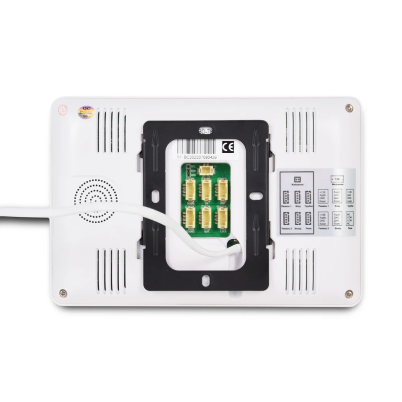 Состоит из цветного видеодомофона белого цвета с экраном 7 дюймов и сенсорными кнопками управления и цветной вызывной панели черного цвета с разрешением 1000ТВЛ и накладным способом установки. К домофону возможно подключить 2 панели вызова и 2 аналоговые камеры, поддерживается запись фото/видео, есть детектор движения на 4 канала (одновременно запись с 1, где есть движение), слот для карт памяти до 32ГБ.