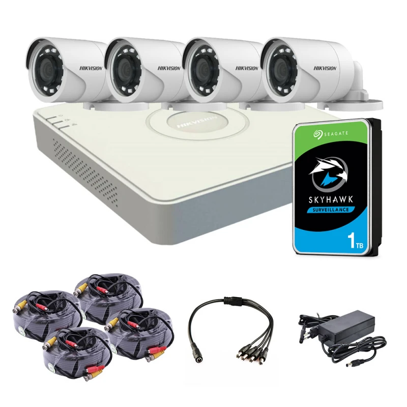 Комплект видеонаблюдения для улицы - 2 Мп состоит из видеорегистратора Hikvision DS-7104HQHI-K1(S), жесткого диска 1TB Seagate Skyhawk ST1000VX005, 4-х HDCVI видеокамер Hikvision DS-2CE16D0T-IRF (C) (3.6 мм), блока питания Full Energy BGP-123Pro 12 В / 3 А, разветвителя питания ATIS L4 и 4-х BNC-power кабелей ATIS