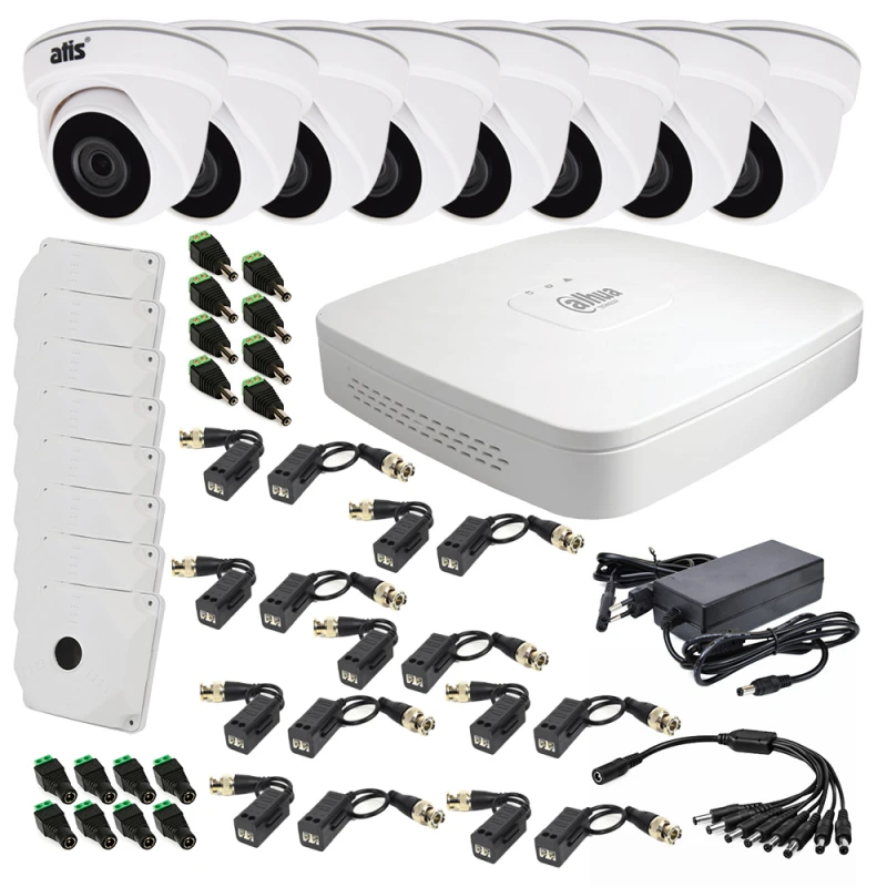 Комплект видеонаблюдения внутренний 2 Мп включает в себя XVR видеорегистратор 8-канальный Dahua DH-XVR4108C-I с AI функциями для систем видеонаблюдения, 8 MHD-видеокамер ATIS AMD-2MIR-20W/2.8 Lite, блок питания Full Energy BGP-125Lite 12 В / 5 А, 8 монтажных коробок ATIS AB-Q130 (SP-BOX-130), 8 приемников-передатчиков ATIS AL-200 UHD (pair), разветвитель питания ATIS L8, 8 разъемов-power ATIS под зажим (мама), 8 разъемов-power ATIS под зажим (папа).