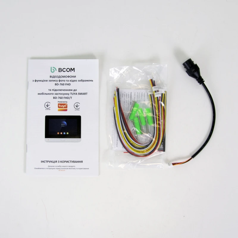 В комплекте видеодомофон + вызывная панель BCOM BD-760FHD/T Silver + BT-400FHD Silver предусмотрено всё для беспроблемной установки: монтажные аксессуары, соединительные провода и установочные кронштейны.