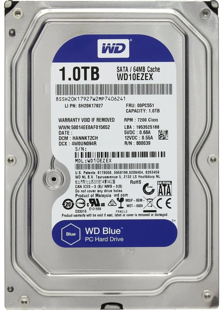 Накопичувач HDD SATA 1.0TB WD Blue 7200rpm 64MB (WD10EZEX)