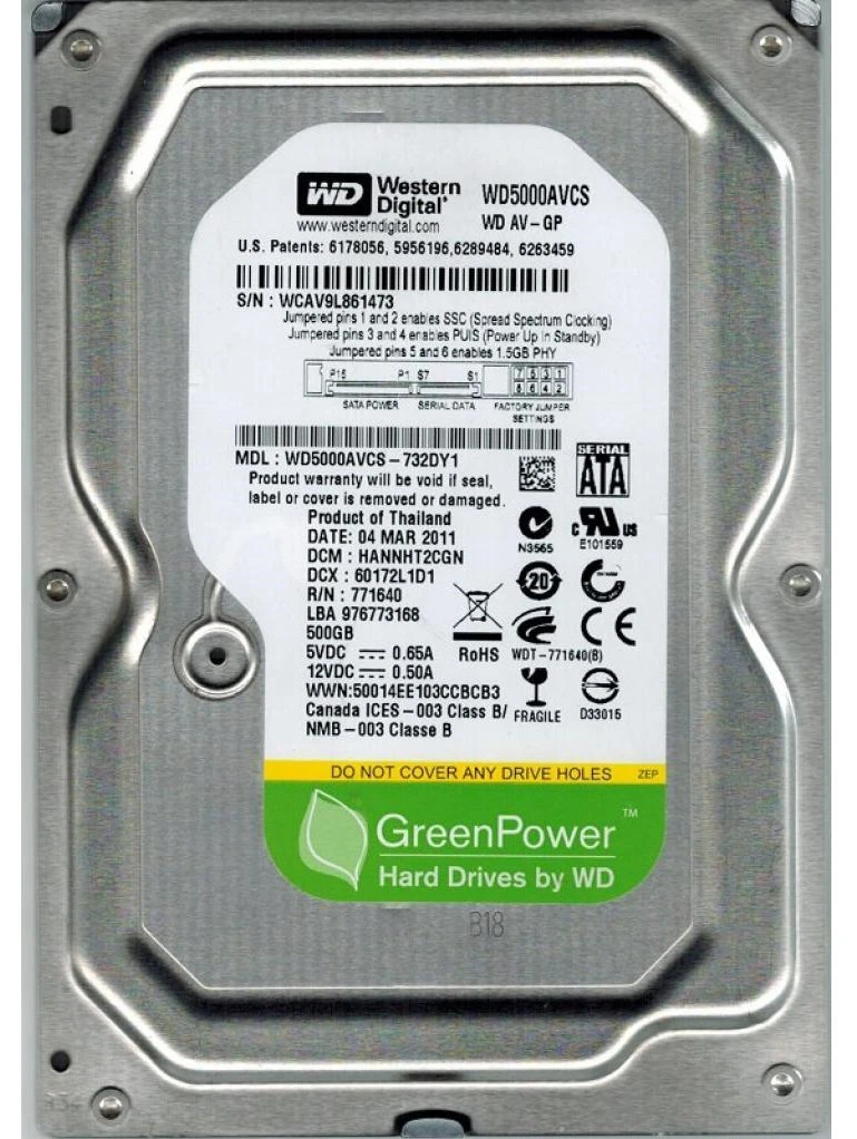 Накопичувач HDD SATA 500GB WD AV-GP 8MB (WD5000AVVS) Refurbished