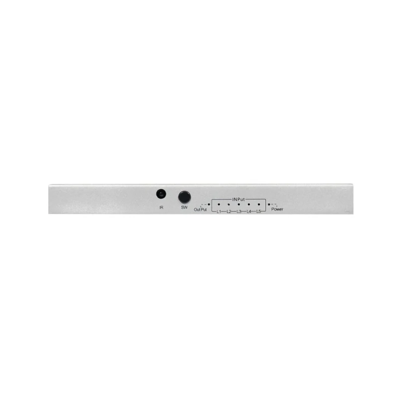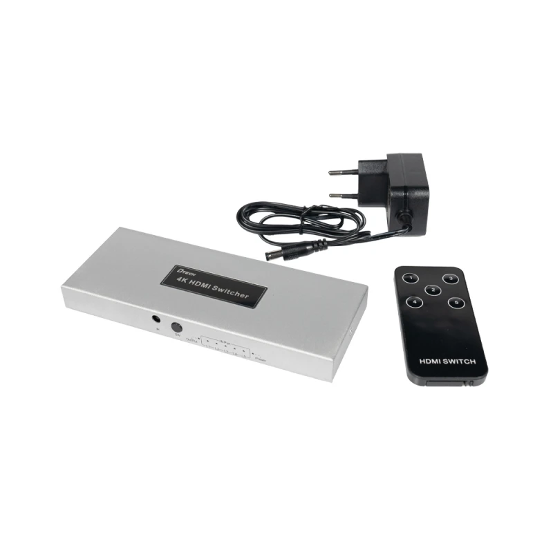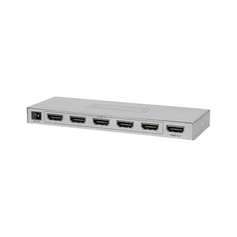 4K HDMI комутатор; 5 вхідних портів HDMI, 1 вихідний порт HDMI; підтримка роздільної здатності до 3840*2160@60Hz; аудіоформати DTS-HD / Dolby-trueHD / LPCM7.1 / DTS / DOLBY-AC3 / DSD / HD(HB); ІЧ-пульт керування у комплекті; живлення DC 5 В; розміри 57.5 / 46 / 32.5 мм