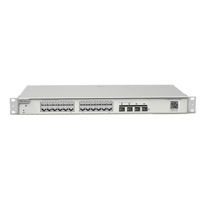 Ruijie Reyee RG-NBS5100-24GT4SFP гігабітний 28-портовий керований комутатор рівня 2+ без підтримки PoE. Комутатор має 24 порти Gigabit Ethernet з підтримкою передавання даних зі швидкістю до 1 Гбіт/с і 4 SFP-порти для під'єднання оптичних модулів. Пропускна здатність: 56 Гбіт/с. Швидкість пересилання: 42 Мбіт/с. Таблиця MAC-адрес: 16000. Захист порту від грозового перенапруження: 6 кВ. Електроживлення: 100-240 В змінного струму, 1,5 A. Енергоспоживання: ≤ 28 Вт