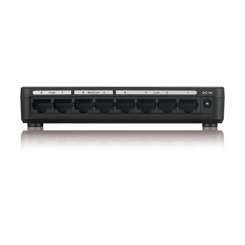 8-портовий настільний гігабітний Ethernet-комутатор для мультимедійних пристроїв Zyxel GS-108S v2 забезпечує легке одночасне підключення до домашньої мережі кілька мультимедійних пристроїв на швидкості 1 Гбіт / сек. Використання GS-108S v2 усуває ривки і паузи при потоковому відтворенні відео і в онлайнових іграх.Пристрій Plug-and-play, стильний дизайнЗа допомогою зручних функцій plug-and-play Zyxel GS-108S v2 без будь-якого конфігурації підключає до домашньої мережі VoIP-телефони, медіа-плеєри, ігрові консолі, телевізійні приставки та пристрої для перегляду Web-сторінок. Стильний витончений дизайн корпусу GS-108S v2 добре вписується в інтер’єр сучасного приватного будинку або квартири.Відтворення мультимедіа та ігор без ривків і паузУ Zyxel GS-108S v2 використовуються порти з QoS для призначення високого, звичайного і низького пріоритету для окремих мережевих додатків. Наприклад, для високоякісного відтворення голосу і мультимедіа можна підключити до портів з високим пріоритетом VoIP-телефон або мультимедіа-плеєр. Для участі в онлайнових іграх можна підключити ігрову консоль до порту QoS зі звичайним пріоритетом, а якщо вам потрібно тільки переглядати Web-сторінки на своєму ПК або ноутбуці, то підключіть комп’ютер до порту QoS з низьким пріоритетом.