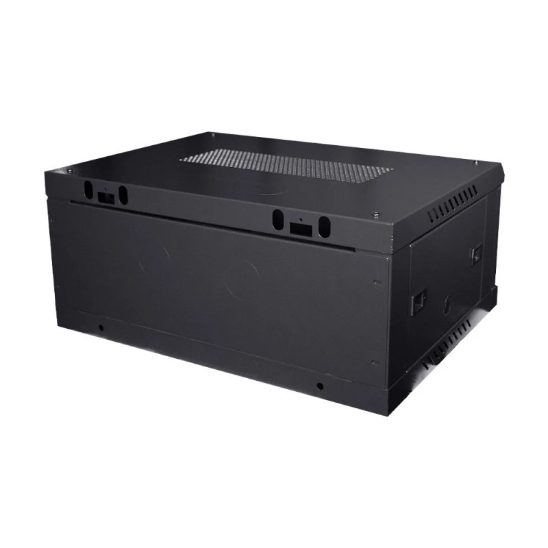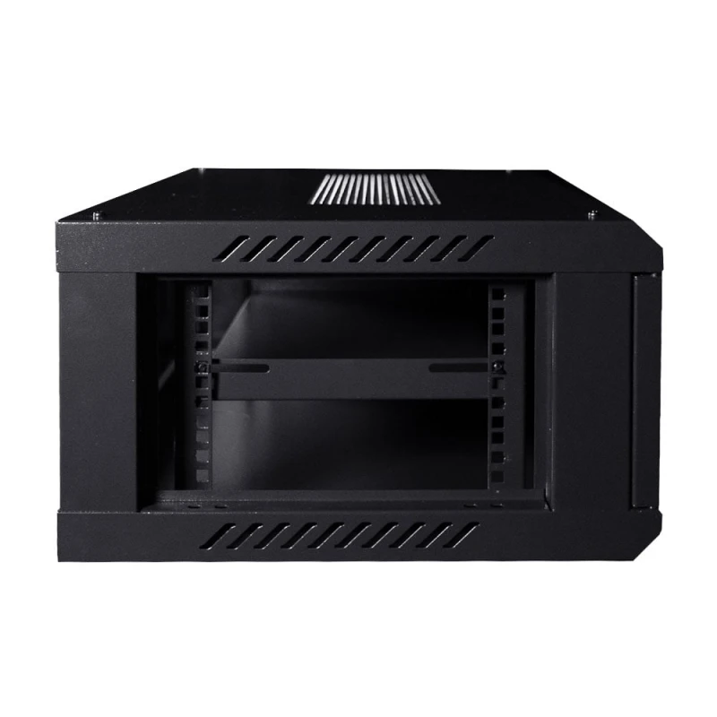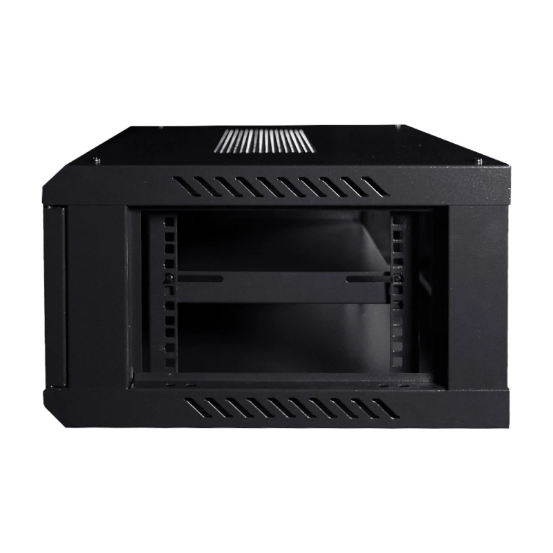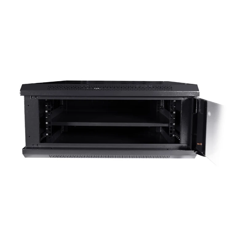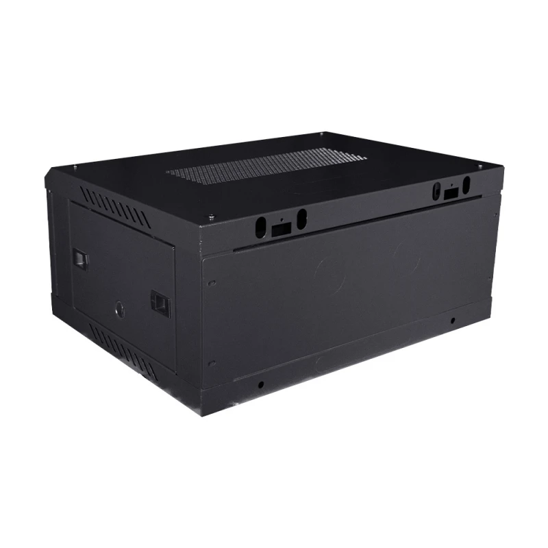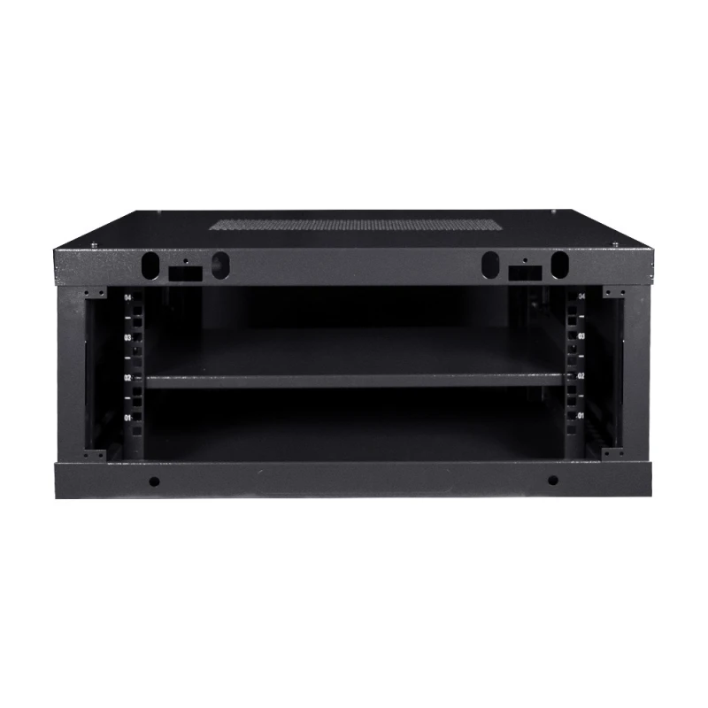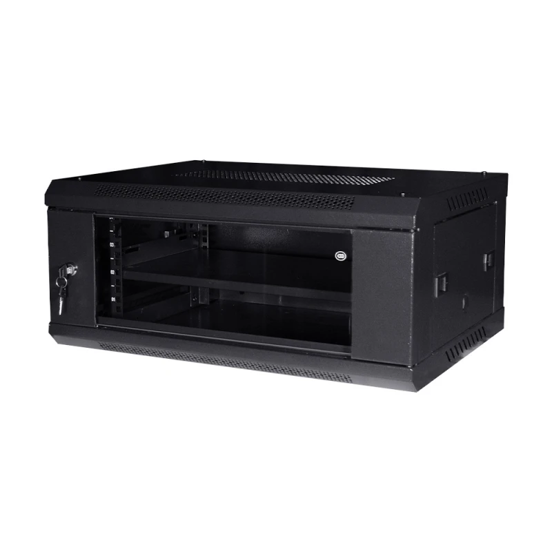 Комутаційна шафа з габаритними розмірами: ширина 600 мм, глибина 450 мм, висота 4U – 270 мм; максимальне навантаження 100 кг; матеріал корпусу: сталь, пофарбована порошковою фарбою чорного кольору RAL9005; дверцята із загартованого скла, зачиняються на замок (2 ключі у комплекті); кабельні введення у верхній, нижній та задній панелях; ступінь захисту IP20; постачання – у розібраному вигляді
