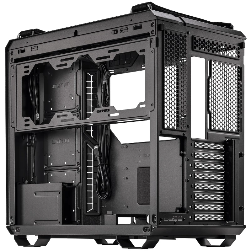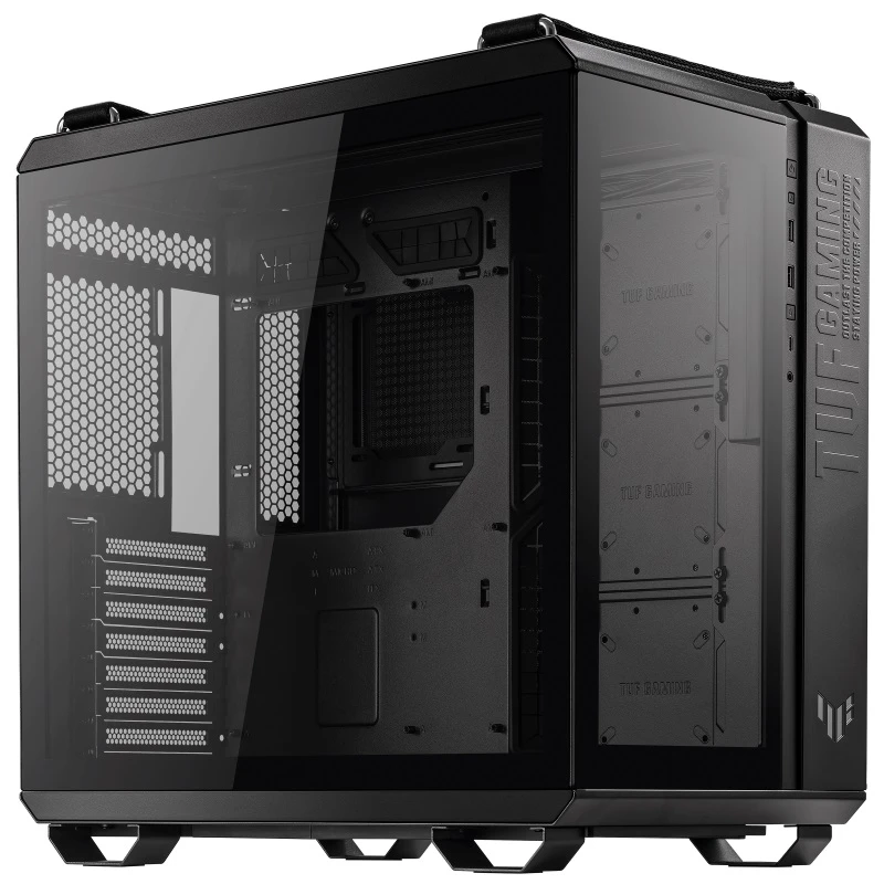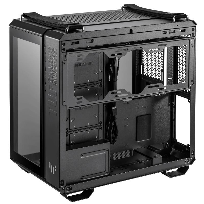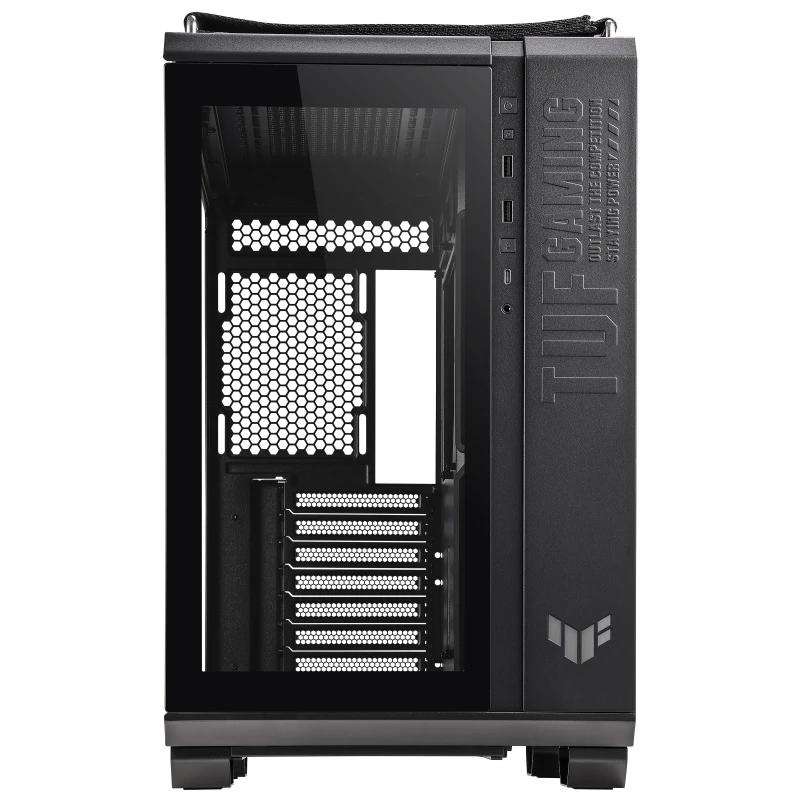 Двокамерне шасі TUF Gaming GT502 налаштовує незалежні зони охолодження для ЦП і ГП Панорамний вид Панелі із загартованого скла забезпечують тактовно тонований вигляд для демонстрації вашої конструкції Високошвидкісний USB Type-C на передній панелі На передній панелі є порт USB 3.2 Gen 2 Type-C, який підтримує швидкість передачі даних до 10 Гбіт/с. Бічні панелі без інструментів Бічні панелі можна зняти, просто натиснувши кнопку, приховану на задній частині шасі