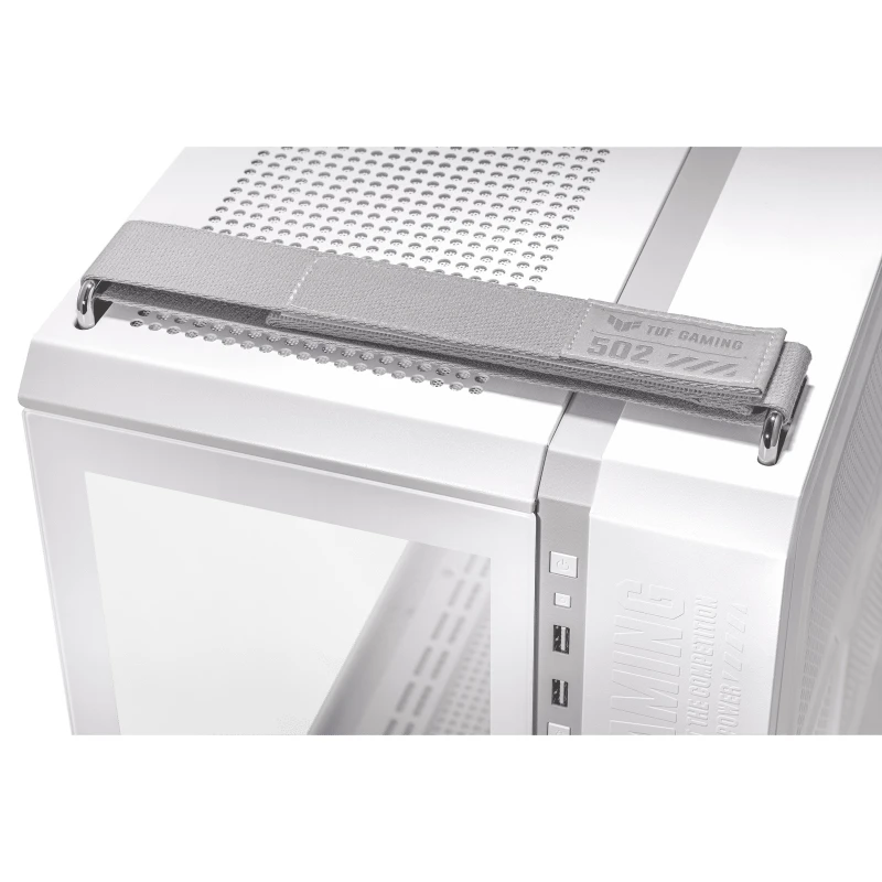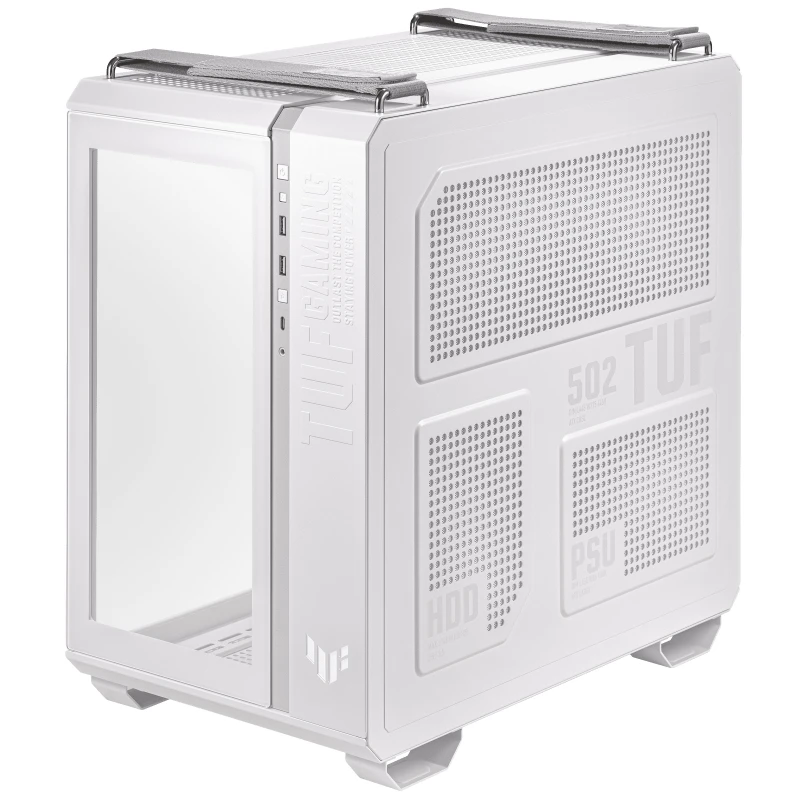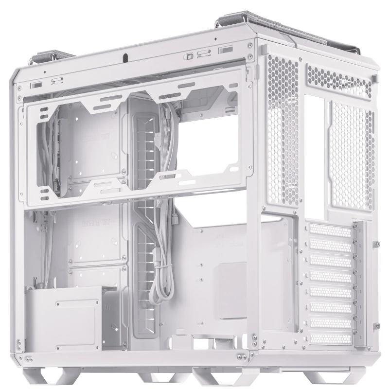 Двокамерне шасі TUF Gaming GT502 налаштовує незалежні зони охолодження для ЦП і ГП Панорамний вид Панелі із загартованого скла забезпечують тактовно тонований вигляд для демонстрації вашої конструкції? Високошвидкісний USB Type-C на передній панелі На передній панелі є порт USB 3.2 Gen 2 Type-C, який підтримує швидкість передачі даних до 10 Гбіт/с. Бічні панелі без інструментів Бічні панелі можна зняти, просто натиснувши кнопку, приховану на задній частині шасі