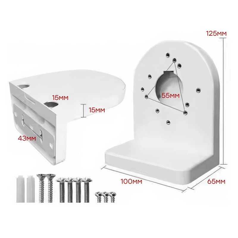 Настінний кронштейн для камер відеонагляду; матеріал – пластик, стійкий до механічних впливів та температурних коливань; отвори для кабелів; розміри 125 / 100 / 65 мм