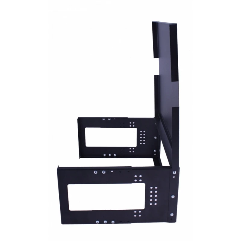 - После установки второго кронштейна и масштабирования по высоте количества юнитов, крышка нижнего кронштейна становиться дном верхнего и позволяет разместить оборудование без встроенного крепления стандарта 19 дюймов.