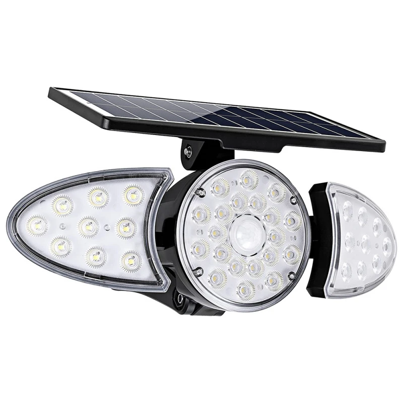 Світлодіодний світильник на сонячних батареях з 3 головками, сонячні панелі з полікристалічного кремнію 4 В / 2,5 Вт, літій-іонний акумулятор 3.2V / 2500mAh, час роботи до 10 годин, час зарядки 4-6 годин, виявлення руху до 8 метрів 120 градусів.