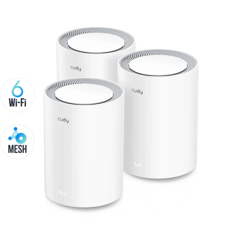 Mesh-система, комплект з 3 WiFi 6 Mesh гігабітних пристроїв; двоядерний процесор; дводіапазонний WiFi; 1201 Мбіт/с на 5 ГГц + 574 Мбіт/с на 2.4 ГГц; 802.11a/b/g/n/ac/ax; 2 гігабітні порти Ethernet; 4 внутрішні антени; MU-MIMO; Beamforming; DDNS; VPN PPTP / L2TP / OpenVPN / WireGuard / IPsec; підтримка сервісу Zerotier; DNS через CloudFlare / NextDNS / Google; IPv6; безшовний роумінг; протоколи віддаленого керування TR069 / TR098 / TR111 / TR181; живлення 12 В/1 А, блок живлення у комплекті; розміри 154 (висота) / 109 (діаметр) мм