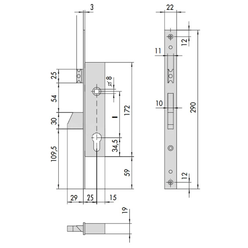 Механизм замка CISA 46215.25 язычок (BS25*85мм, 22 мм) нержавеющая сталь