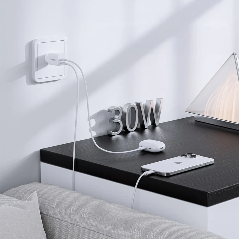 Мережевий зарядний пристрій (PD 35 Вт) з 2 USB-портами: USB-C та USB-A; вхідна напруга 100-240 В 50/60 Гц 1.2 А макс; вихід 1 USB Type-C: 5В/3А, 9В/3А, 12В/2.91А, 15В/2.33А, 20В/1.75А (35 Вт макс.); вихід 2 USB Type-A: 5В/3А, 9В/3А, 12В/2.5А, 20В/1.5А (30 Вт макс.); спільний вихід (USB Type-A + USB Type-C) 5В/3.4А (17 Вт макс.); дисплей для відображення стану заряджання; розміри 40 / 33 / 80 мм; вага 67.5 г