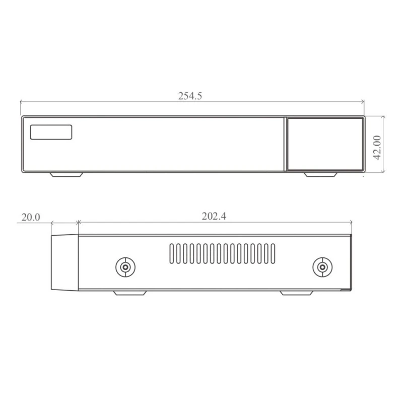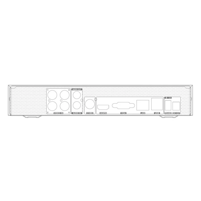 MHD-відеореєстратор 4-канальний гібридний АHD/TVI/CVI + 2 канали IP; підтримка роздільної здатності 5MP/4MP/1080P/960P/720P у форматі H.264/H.265/H.265+; вхід BNCx4, виходи: HDMI / VGA / CVBS, аудіо: вхід RCAx1 / вихід RCAx1; запис 5Mp lite @10fps, 4MP lite/1080P @12fps, 1080 lite/720P/WD1/D1 @25fps, IP@25fps; бітрейт на кожному каналі: 32Kbps ~ 4Mbps; мережа RJ45 100Mbps; перегляд архіву локально/віддалено 4/4 канали; підтримка роботи з iOS, Android; інтерфейс RS485х1, USB2.0х2, SATA x1 до 10 ТБ, живлення DC12V/1.5A, споживання 5 Вт; розміри: 255 / 222 / 42 мм