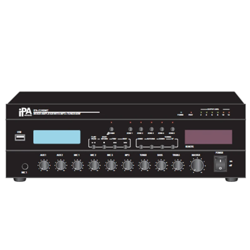 Микширующий усилитель IPA-Z240МТ с 2-мя аудио источниками предназначен для построения систем оповещения магазинов, школ, церквей, отелей, заводов, вокзалов и аэропортов. 5-зонный микширующий усилитель оснащен 3-мя микрофонными входами и одним дополнительным входом AUX. Вход ЕМС МІС1 VOX для системы привлечения внимания и возможность трансляции предварительно записанных голосовых сообщений делают этот усилитель универсальным в то время как его стоимость остается доступной.