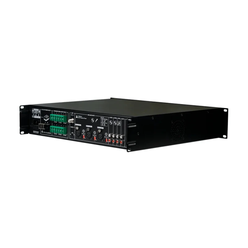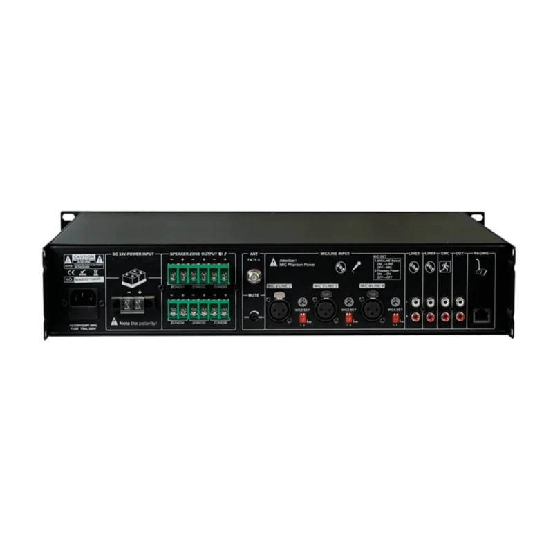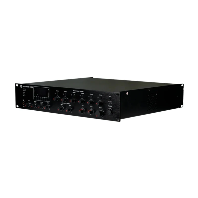 Мікшуючий підсилювач DA-500MT CMX. 6-зонний підсилювач-мікшер з MP3 / USB / FM-тюнером / Bluetooth, номінальна вихідна потужність якого становить 500 Вт. Він ідеально підходить для озвучування шкіл, супермаркетів, банків, готелів та інше. Цей прилад складаться з трьох складових: попередній підсилювач, мікшер та підсилювач потужності. Все розміщене в одну 19-дюймову одиницю висотою 2U, що є економічним, але дуже надійним рішенням. Додатково встановлені інтерфейси: Mic1 (6,3 мм) і Mic/Line вхід 2-4 (XLR), два лінійні входи, один вхід EMC та один вхід RJ45 для 6-зонного віддаленого мікрофона. Mic1 VOX вхід з найвищим пріоритетом крім входу ЕМС. Один роз'єм USB та один слот microSD на передній панелі забезпечують легкий доступ та експлуатацію кінцевим користувачам. Підсилювач має конструкцію з повним захистом від перевантаження, короткого замикання та високої температури, щоб уникнути будь-яких пошкоджень. Ці підсилювачі підходять для використання у банках, школах, готелях, ресторанах, тематичних центрах та магазинах.