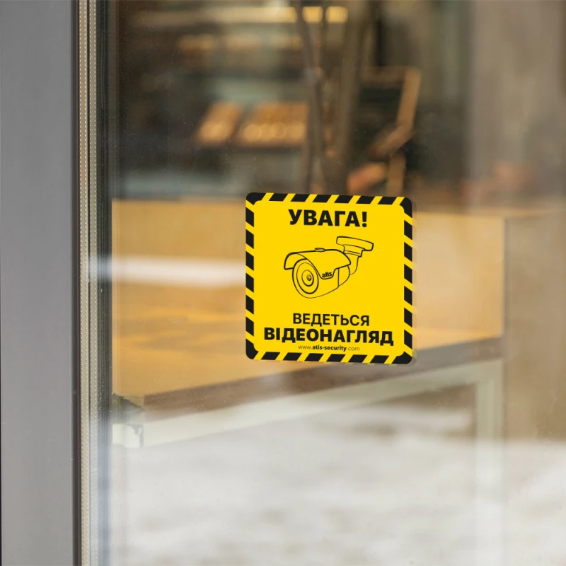 Наклейка желтая «Ведеться відеонагляд» предназначена для наклеивания в местах, где установлено видеонаблюдение, для информирования людей о наличии видеокамеры, на которую осуществляется запись происходящего снаружи или внутри помещения.