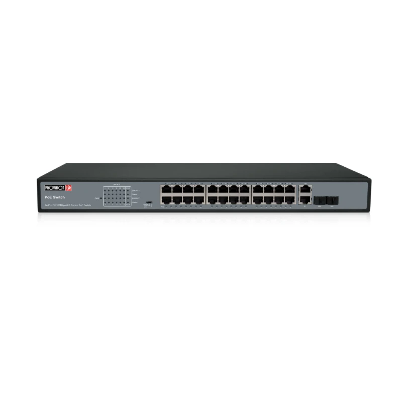 - 24 порта Downlink: 10/100Mbps PoE; порты Combo: 2 х 1Gbps Uplink/ 2 х 1Gbps SFP