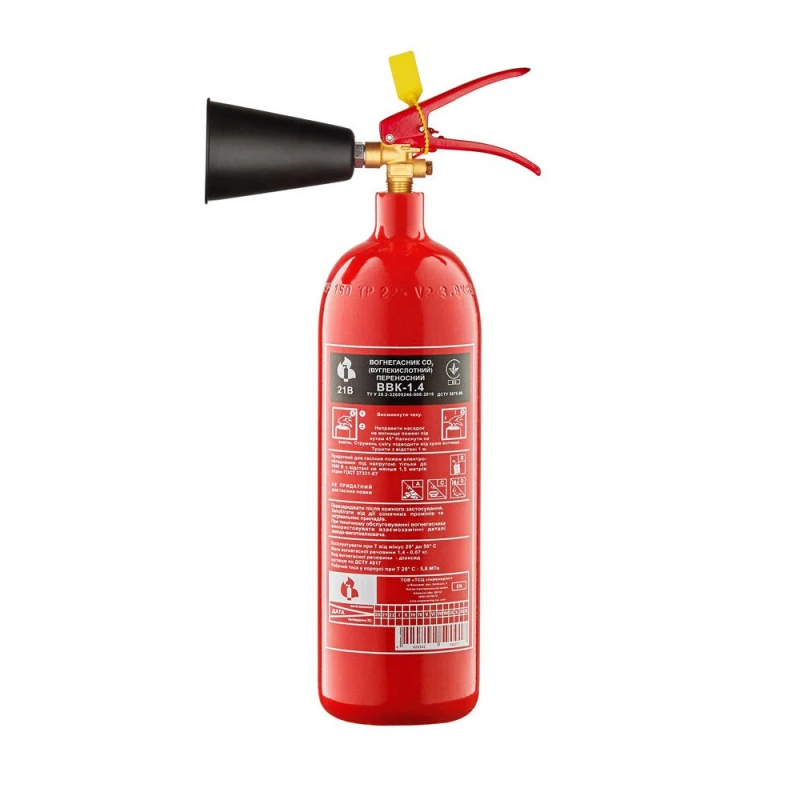 Огнетушитель углекислотный ВВК-1,4 (ОУ-2) для локализации пожара класса B (горение жидкостей), C (горение газов), E (грение веществ и материалов электроустановок, находящихся под напряжением).