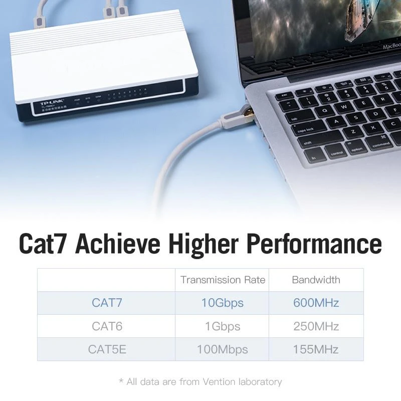 Кабель категорії САТ 7 Мережевий кабель Vention Ethernet RJ45 САТ 7 призначений для комутації комп'ютерних Ethernet-мереж зі стандартами 10ВАSЕ-Т (10 Мбіт/сек), 100ВАSЕ-Т(х) (100 Мбіт/сек), 1000ВАSЕ-Т(х) (1 Гбіт/сек) ), 10GBASE-Т (10 Гбіт/сек). 10-гігабітний Ethernet (10GbЕ) Кабель здатний забезпечити швидкість передачі даних у мережах Ethernet до 10 Гбіт/с при використанні стандартних конекторів 8Р8С. Індивідуальний та загальний екран SSТР Індивідуальні екрани з фольги для кожної кручений пари, плюс загальний екран з металевим обплетенням, надійно захищає від зовнішніх і перехресних перешкод між крученими парами. Ізоляція кабелю PVC LSZH Зовнішня оболонка кабелю виготовлена із полівінілхлориду (РVС) з додаванням крейди. Для виготовлення оболонки використовуються полімери, які не розповсюджують горіння при груповому прокладанні і не виділяють при нагріванні галогени (такі кабелі маркуються абревіатурою LSZH: low smoke zero halogen - малої димності, що не виділяє галогенів. Кабель дозволяється прокладати та використовувати в закритих областях, де можуть проходити повітряні потоки системи кондиціювання та вентиляції. Позолочені контакти Патч-корд оснащений з двох сторін роз'ємами-конекторами RJ45, які покриті шаром золота та міді для чудової передачі даних та довговічності в експлуатації. Широка сумісність Кабель можна використовувати з різноманітними пристроями як у домашніх, так і офісних приміщеннях.