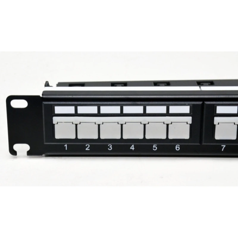 - На лицевой стороне патч-панели расположены 24 порта с разъемами RJ-45 для подключения патч-кордов. Нанесена цифровая маркировка с дополнительным местом для подписи портов