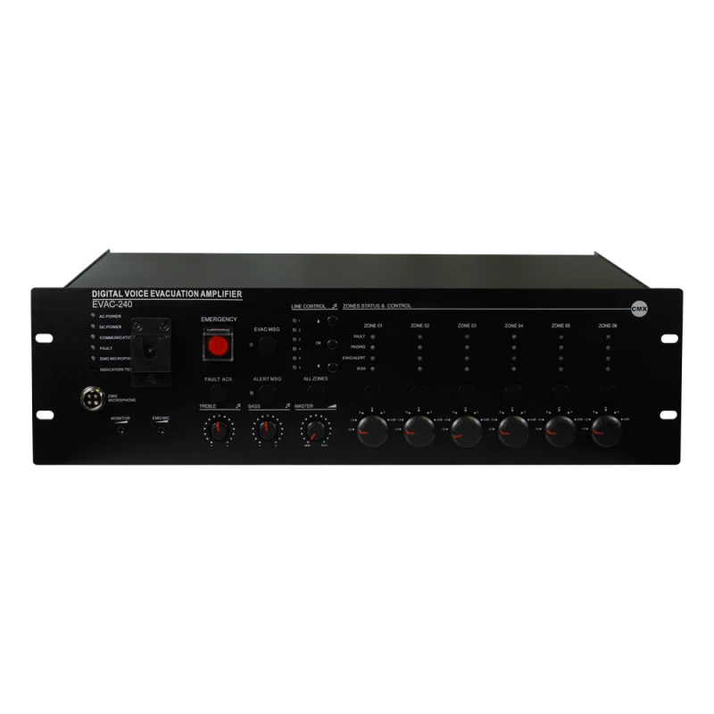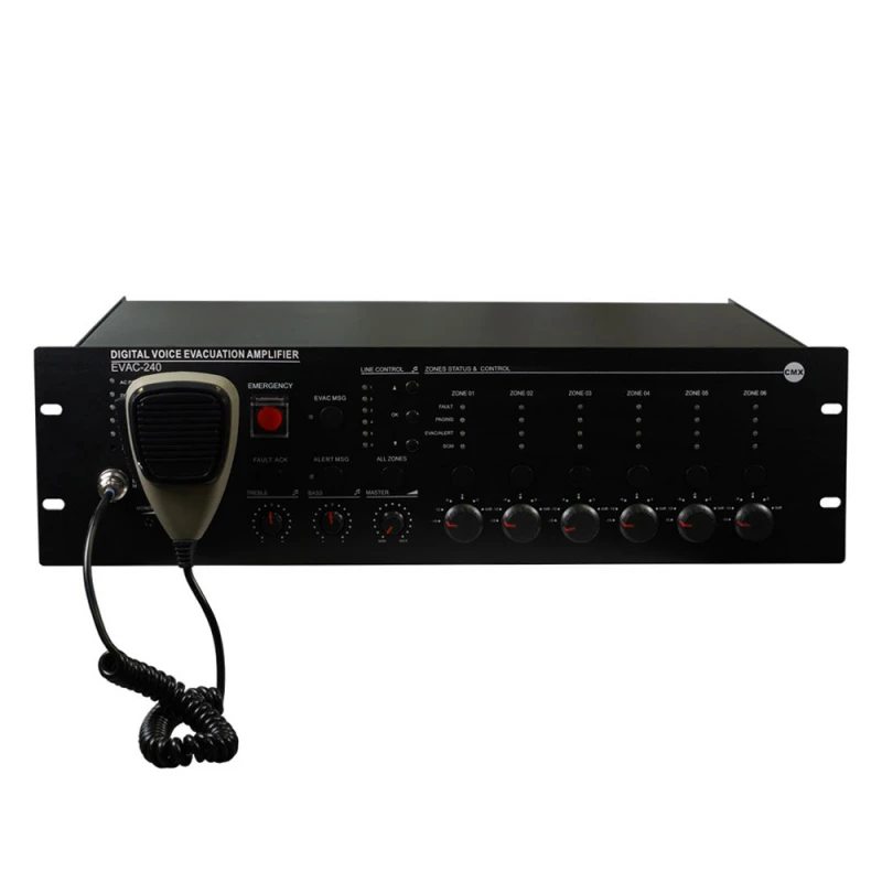 Підсилювач-контролер EVAC-240 CMX є головною системою голосового оповіщення та евакуації, моніторингу всіх основних сигналів, автоматичного оповіщення/трансляції повідомлень EVAC у разі надзвичайної ситуації в місцях скупчення людей, на териториіях підприємств, бізнес-центрів, навчальних закладів, аеропортів і т.ін.