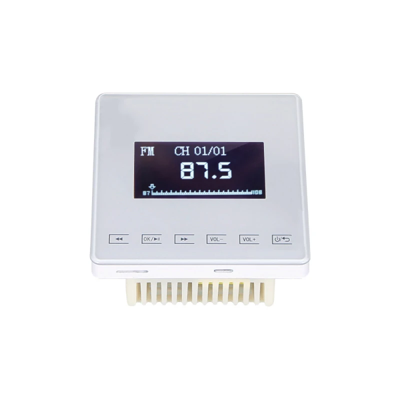 Настінний цифровий підсилювач CMX A5 з Bluetooth на два канали по 15 Вт на 8 Ом. FM-діапазон 87.5-108 МГц, частотний діапазон 20-20000 Гц (при ± 0.3 дБ), дисплей 2.8", 320x240 пікселів. Врізний монтаж.