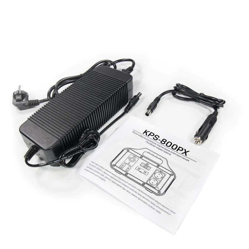 - До комплектації, крім зарядної станції, входять блок живлення змінного струму, кабель для підключення до автомобільного прикурювача, посібник користувача.