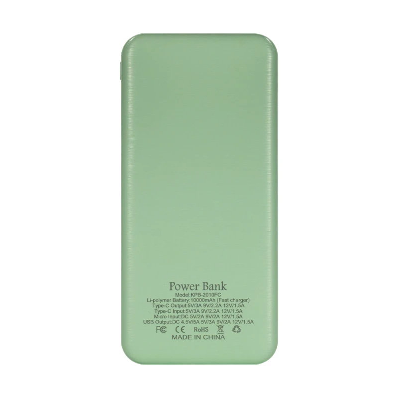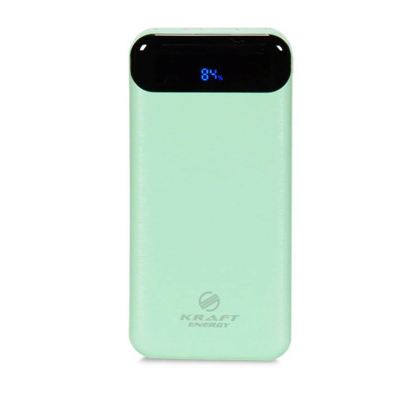 Повербанк Kraft KPB-2010FC Green з ємністю батареї 10000 мАг, літій-полімерна технологія, інтерфейси: вхід microUSB 5 В/2.1 А, вхід/вихід Type-C PD 22.5 Вт 5 В/3 А, 9 В/2 А, 12 В/1.8 А, вихід 2*USB 5 В/3 А, 12 В/1.8 А. Роз'єм USB Type-C підходить і для заряджання підключених пристроїв, і для заряджання самого повербанку. Підтримує швидку зарядку 22.5W QC3.0.