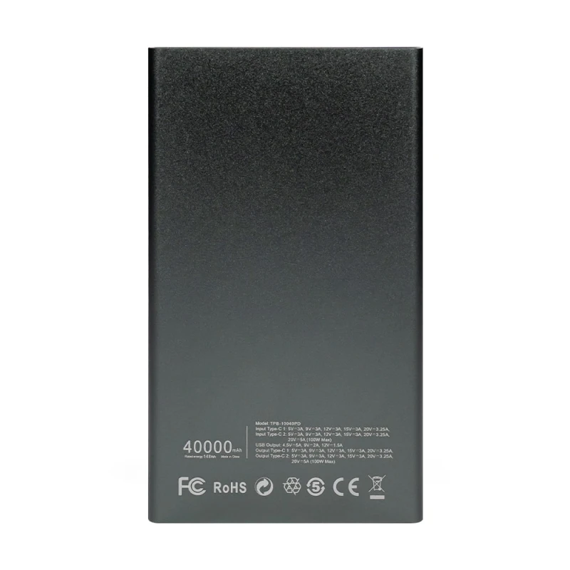 Повербанк Trinix TPB-10040PD Grey з ємністю батареї 40000 мАг, літій-полімерна технологія, інтерфейси: вхід/вихід Type-C2 PD 100 Вт 5 В/2.4 А, 9 В/3 А, 12 В/3 А, 15 В/3 А, 20 В/5 А; вхід/вихід Type-C1 PD 65 Вт 5 В/2.4 А, 9 В/3 А, 12 В/3 А, 15 В/3 А, 20 В/3.25 В; виходи USB1-2 Type-A 5 В/3 А, 9 В/2 А, 12 В/1.5 А; загальна потужність портів Type-C1 та USB1-2 65 Вт. Підтримується режим PPS та режим для роботи обладнання з малим струмом споживання. USB-кабель Type-C to Type-C у комплекті.