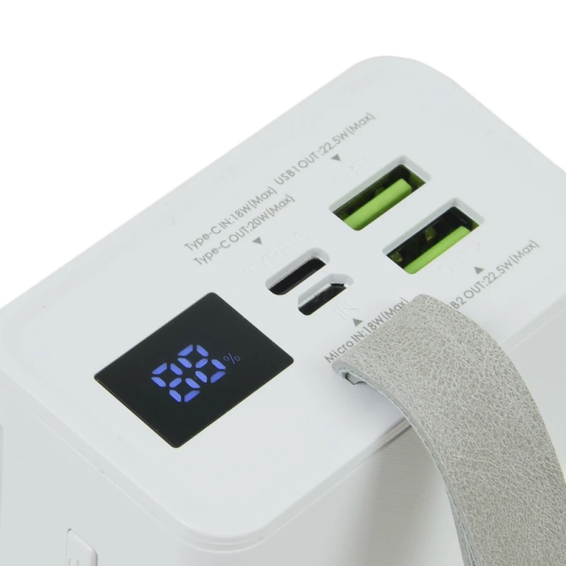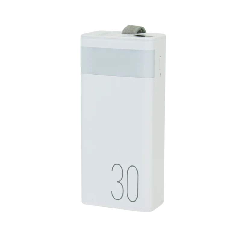 Повербанк Power Bank 20 Вт + 22.5 Вт ємністю 30000 мА/год із швидкою зарядкою та цифровим відсотковим дисплеєм. Інтерфейсні порти: USB Type C/Micro-USB/2 x USB Type A. Вбудований ліхтарик. Тип батареї: літій-полімерний Li-pol. Розмір: 148 x 68 x 39 мм. Вага: 592 г