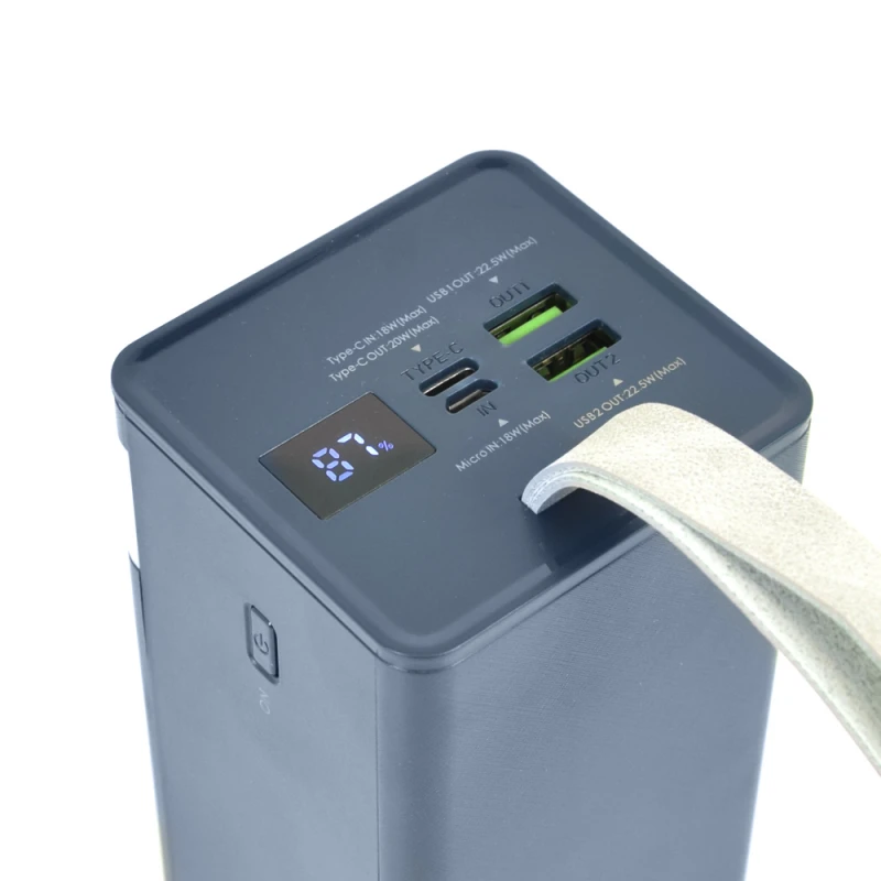 Повербанк Power Bank 20 Вт + 22.5 Вт ємністю 50000 мА/год із швидкою зарядкою та цифровим відсотковим дисплеєм. Інтерфейсні порти: USB Type C/Micro-USB/2 x USB Type A. Вбудований ліхтарик. Тип батареї: літій-полімерний Li-pol. Розмір: 148 x 68 x 63 мм. Вага: 995 г