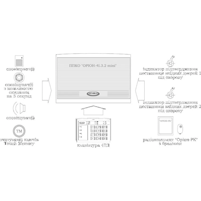 - Управление Орион-4И.3.2 mini осуществляется с помощью ключей Touch Memory и, при необходимости, с клавиатуры, причем реализована поддержка до 16 ключей (кодов доступа) и 8 групп ШС.