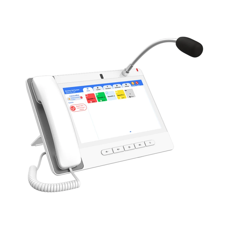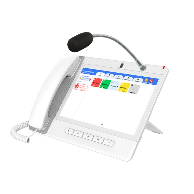 Fanvil Nurse Console Phone A320i — це консольний IP-телефон на базі SIP, спеціально розроблений для використання в медичних установах, зокрема в лікарнях, будинках для людей похилого віку та клініках. Телефон забезпечує ефективний зв'язок між персоналом, пацієнтами та відвідувачами. Оснащений великим 10,1-дюймовим сенсорним екраном з роздільною здатністю 1280×800 пікселів, вбудованою 8-мегапіксельною камерою з механічною шторкою для захисту приватності та мікрофоном на гнучкій ніжці для чіткого двостороннього спілкування. Пристрій підтримує відеодзвінки, групові оповіщення та трансляції екстрених повідомлень, що робить його незамінним помічником у роботі медичного персоналу. Fanvil A320i інтегрується з програмним забезпеченням Nurse Call, а також підтримує різні режими виклику з приліжкових станцій, включно з екстреними та стандартними сигналами виклику. Завдяки підтримці PoE, двох гігабітних портів і модулів Wi-Fi/Bluetooth, телефон легко під'єднується до мережі та обладнання.