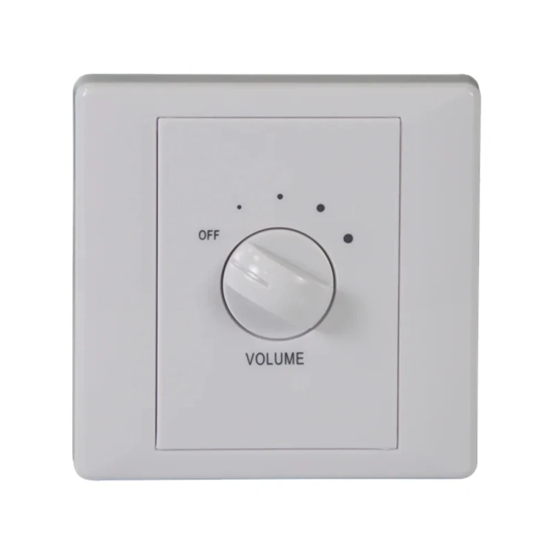 Для системи оповіщення використовується 100-вольтовий регулятор гучності. Для фонової музики використовується 100-вольтовий атенюатор. Регулятор гучності потрібен для економного використання системи, використовується для регулювання вихідної потужності гучномовця в приміщенні. Використовується для підтримки однакового рівня вихідного сигналу для однієї лінії гучномовців, оскільки втрати сигналу в кінці лінії гучномовця досить великі, тому його вихідна потужність менша, тому регулятор гучності додається до передньої частини лінії, щоб знизити вихідний рівень гучномовця, щоб підтримувати однаковий рівень вихідного сигналу для всіх гучномовців в одній лінії.